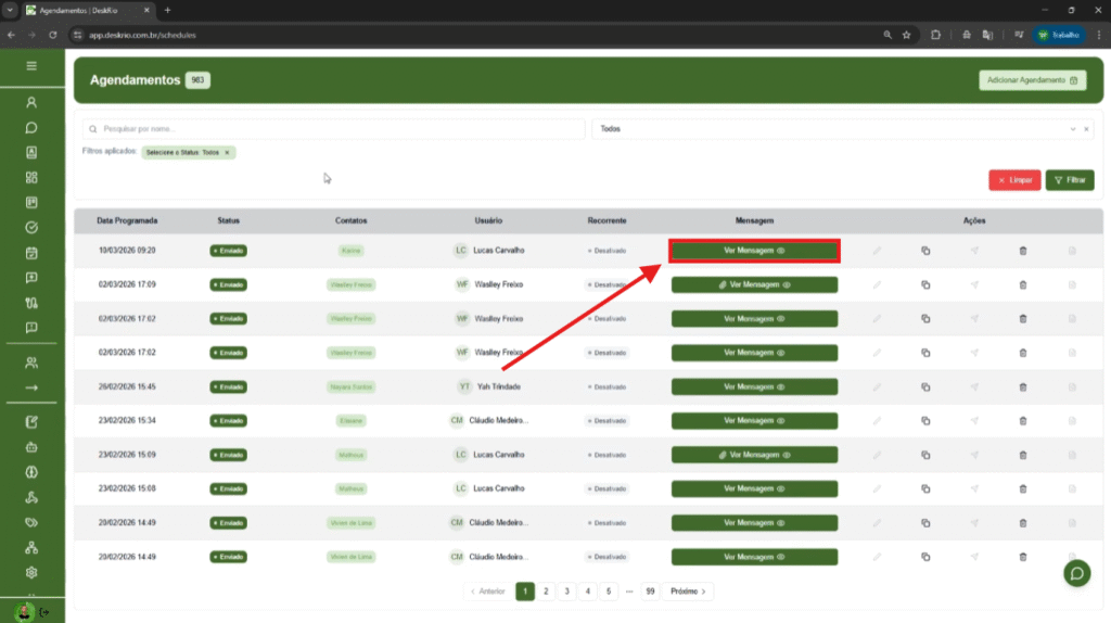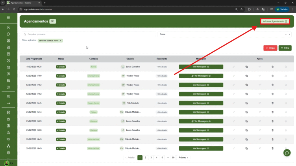 Para criar um novo agendamento, clique no botão Adicionar Agendamento, localizado no canto superior direito da tela.