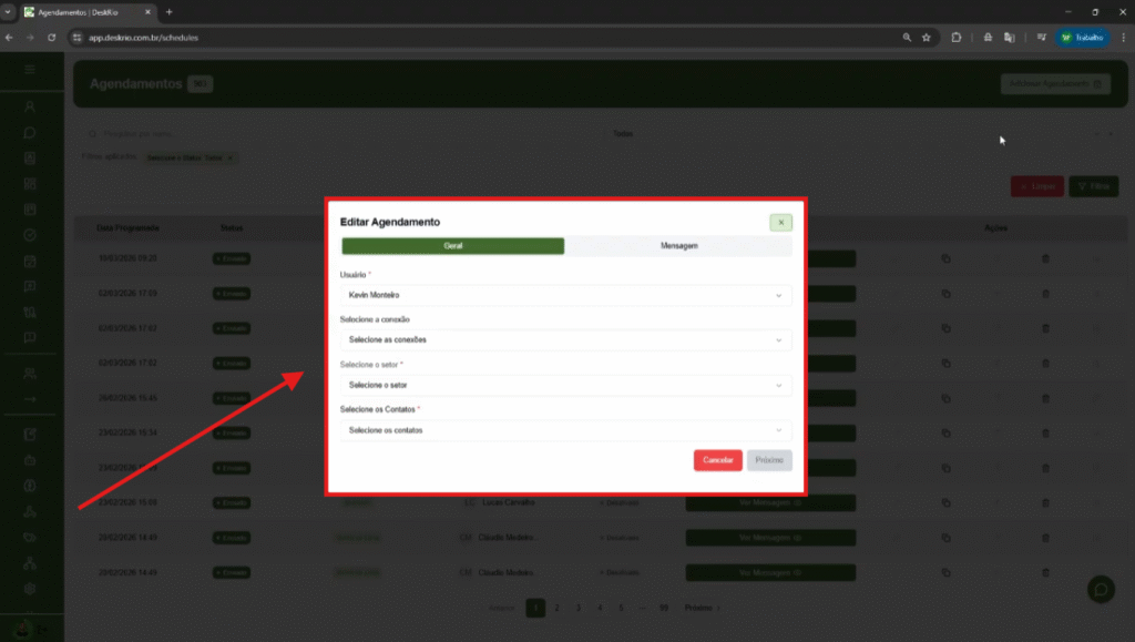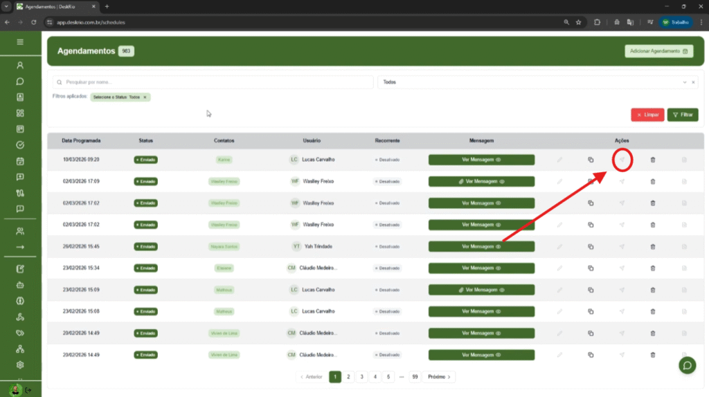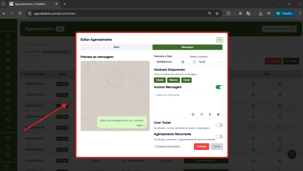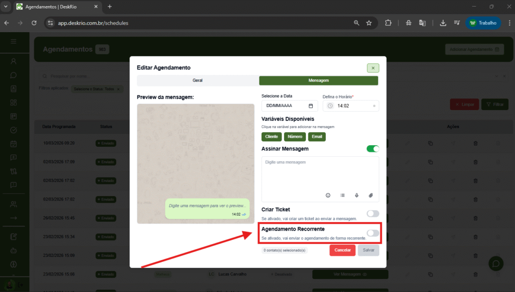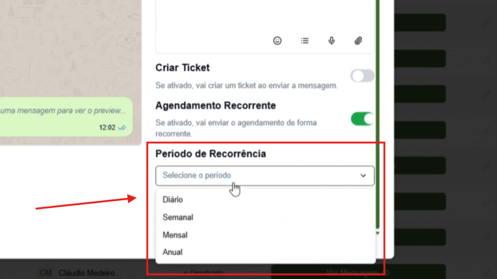 O Agendamento Recorrente é uma funcionalidade ideal para quem precisa enviar mensagens automaticamente em intervalos definidos, sem precisar repetir o processo manualmente.