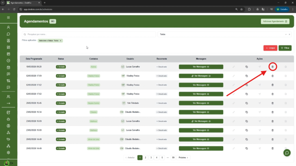 De volta à página principal, você poderá visualizar todos os agendamentos criados e realizar diversas ações: