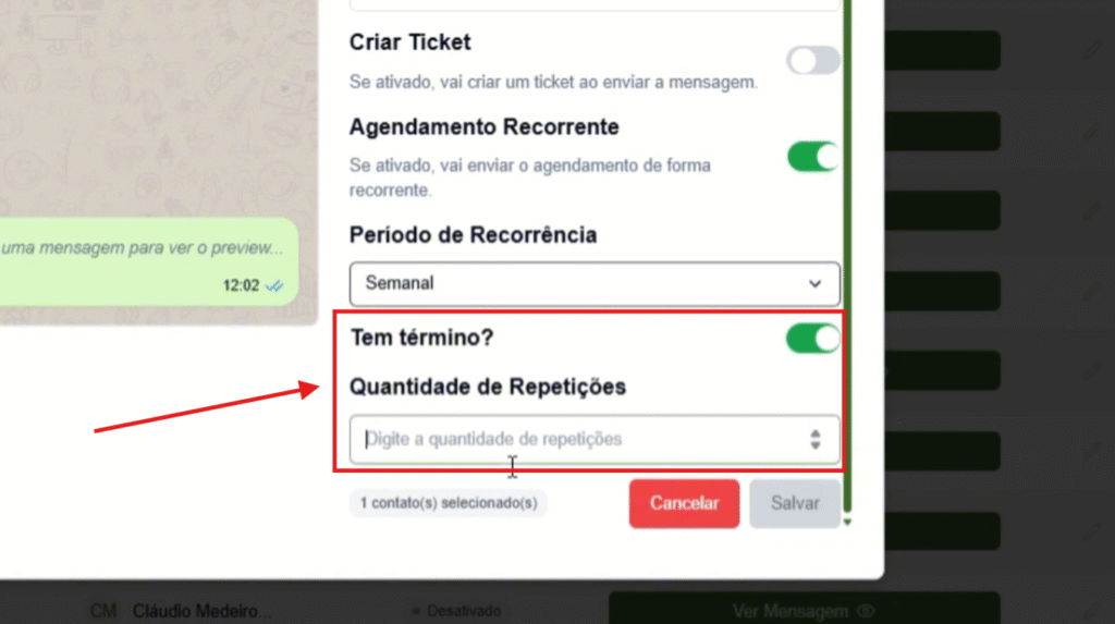 Ative a opção “Tem Término?” e defina quantas vezes o envio será repetido automaticamente.