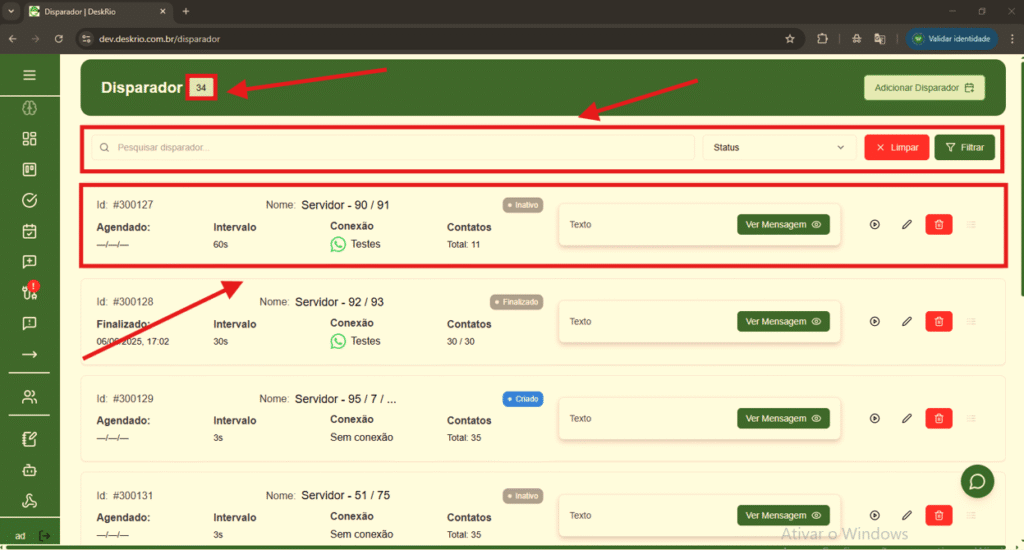 - A lista de disparadores, com informações como ID, nome, status, data agendada, intervalo e quantidade de contatos