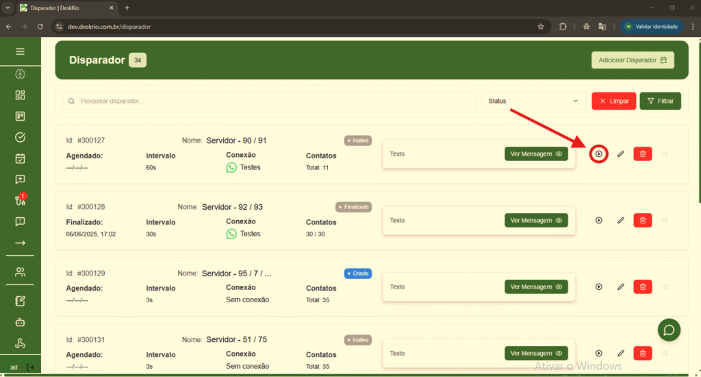 Iniciar disparo: clique no botão Iniciar Disparo, na coluna de ações, para enviar imediatamente.
