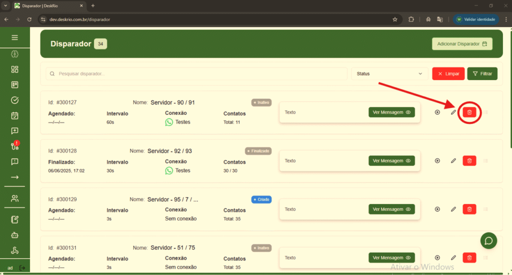 Excluir disparo: clique na lixeirinha na coluna de ações.