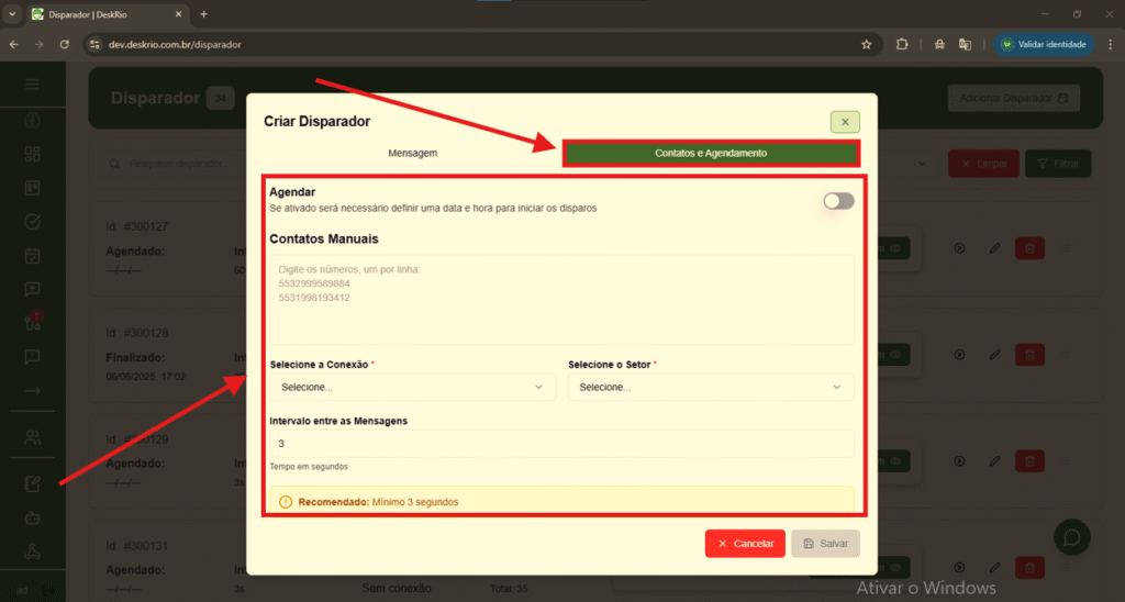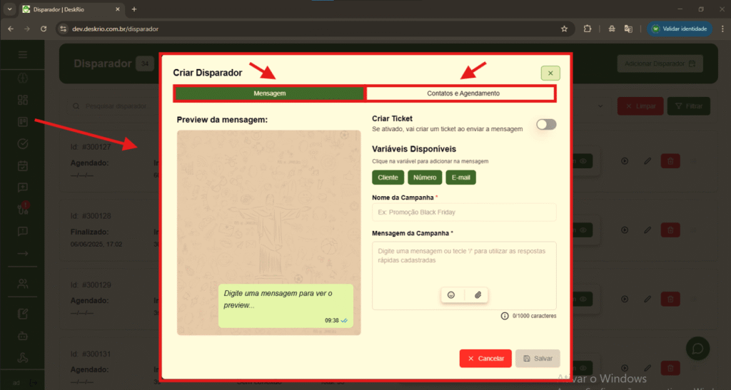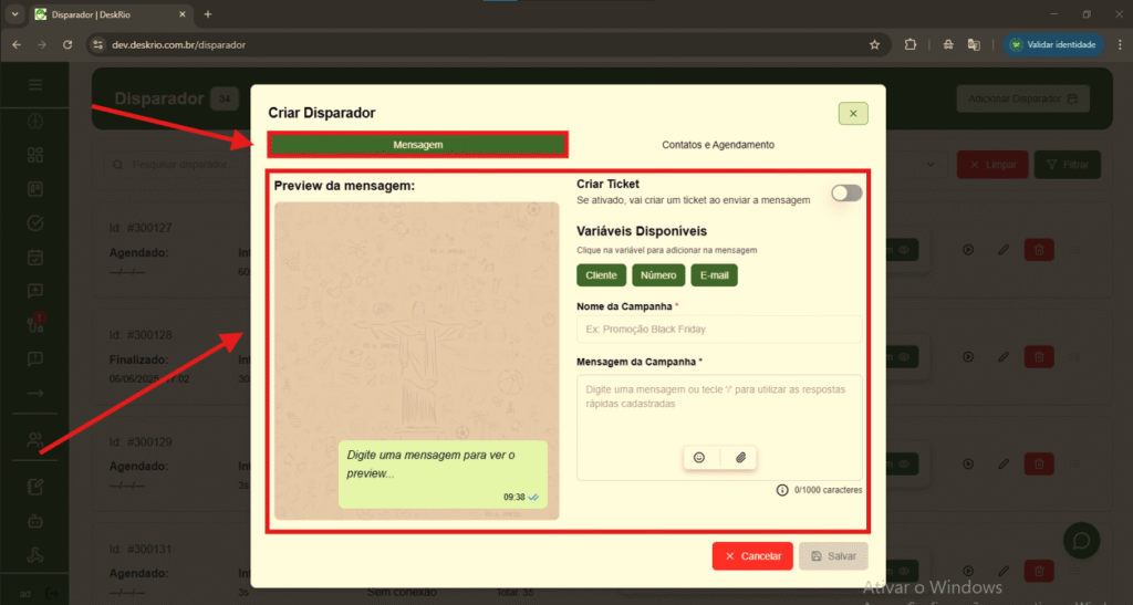 Ao abrir, você terá acesso a duas abas: Aba “Mensagem” e aba “Contatos e Agendamento”