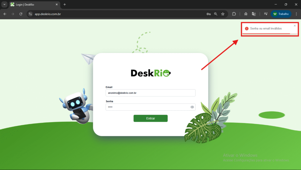 Ao tentar logar na plataforma e não conseguir colocar o login e senha corretamente, receberá a seguinte mensagem na tela: