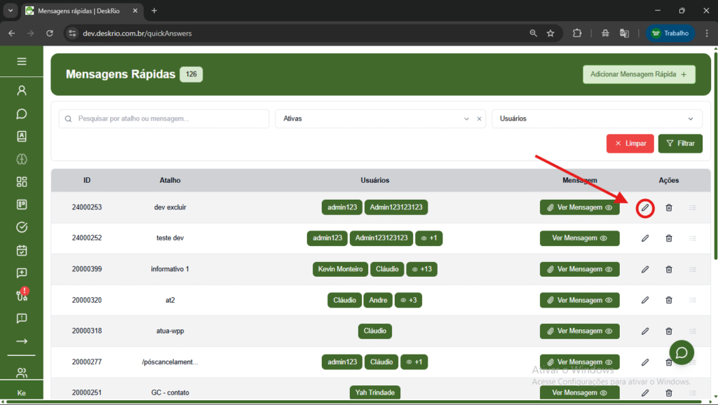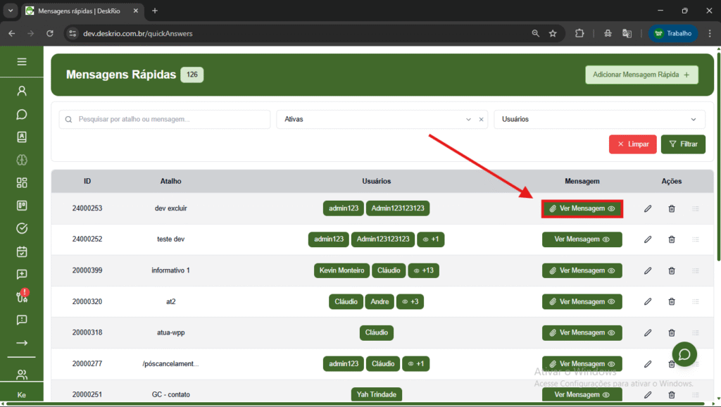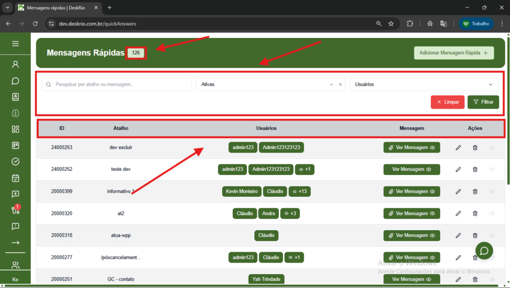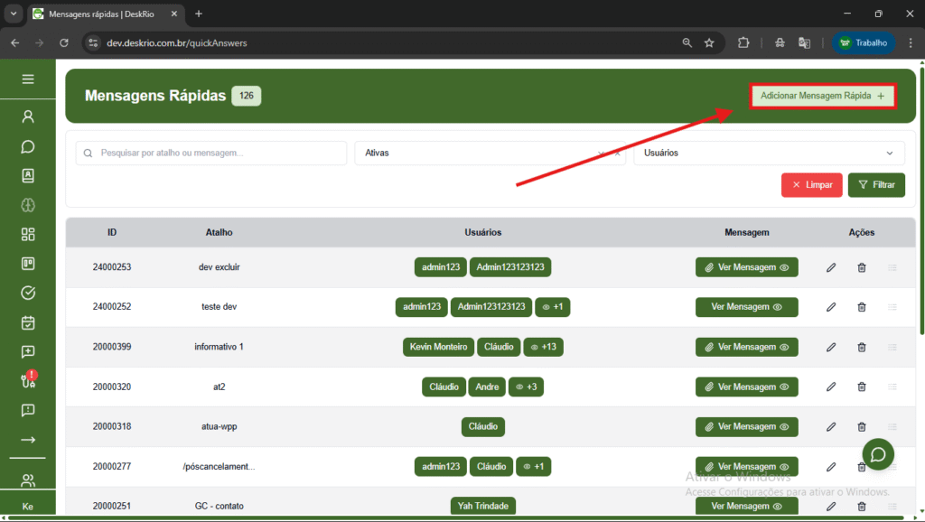 - A lista de mensagens criadas, exibindo: ID, Atalho, Usuários, Mensagem e Ações